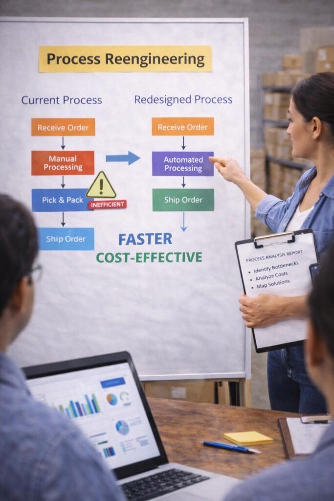 En ocasiones, optimizar no basta; es necesario rediseñar completamente. La reingeniería de procesos implica cuestionar la estructura misma del flujo de trabajo.